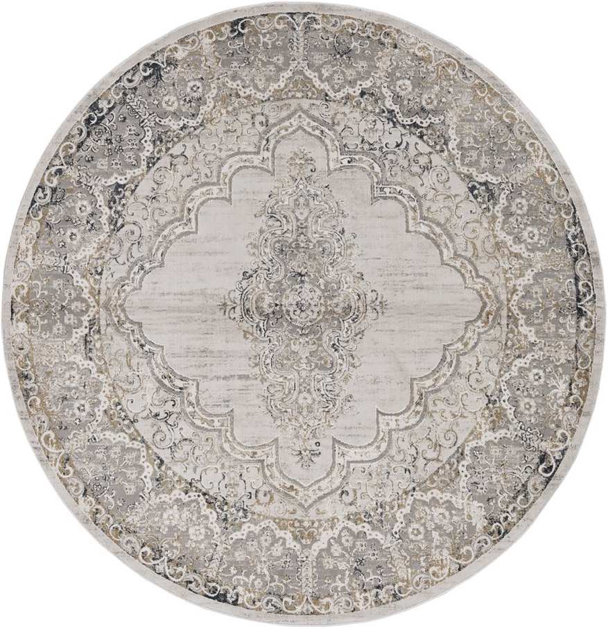 The KAS Generations Ivory Aiden 7'7" Round Area Rug is machine woven of polyester and viscose with no backing. Made in Turkey. Vacuum on floor setting only. Spot clean stains with mild soap and water.Read More