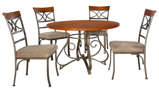 Transitional 5-piece dining set is perfect for gatherings. The round dining table features an interesting curve and scroll designed bottom. The side chairs feature a diamond shaped back, slight curved legs, and upholstered seat covered in a diamond patterned taupe/beige microfiber.Read More