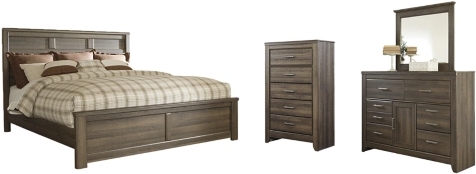 Includes panel bed (headboard, footboard and rails), 6-drawer dresser with mirror and 5-drawer chest